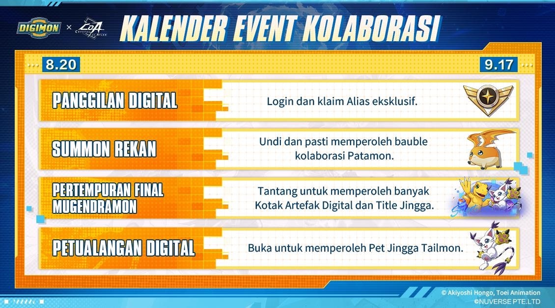 Dengan tagar #DigimonAdventurexCoA, pemain bisa membuat video kreatif bertema Digimon. Hadiah total senilai $7,000 menanti bagi yang beruntung. -