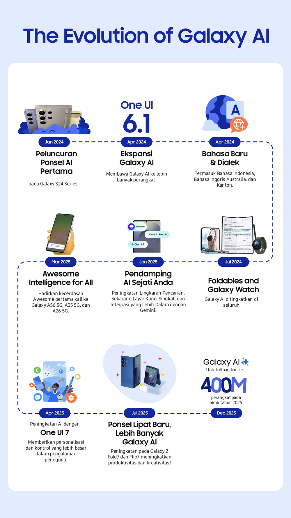Evolusi Galaxy AI menegaskan komitmen strategis Samsung untuk memimpin gelombang inovasi berikutnya dalam teknologi konsumen, tidak hanya di kawasan Asia Tenggara dan Oseania, tetapi juga secara global. Sejak diluncurkan resmi bersama seri Galaxy S24 pada Januari 2024, Galaxy AI telah berkembang pesat—berawal sebagai fitur eksklusif flagship hingga kini hadir luas sebagai kecerdasan terpadu di berbagai perangkat Galaxy.